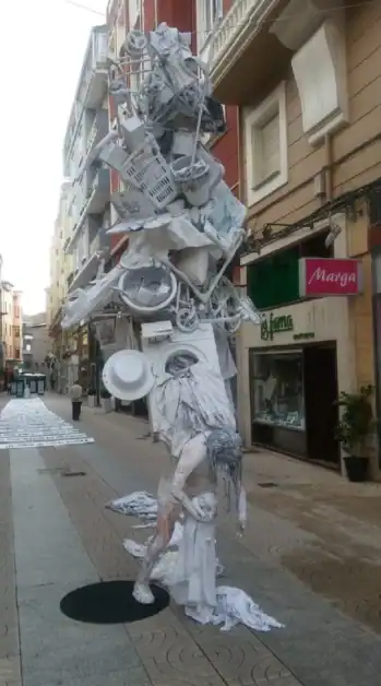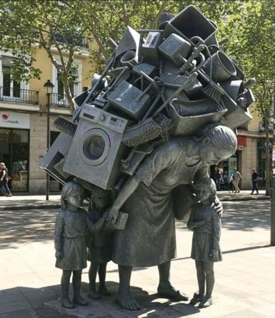 A second sculpture by the artist known as “El Muelle” or “The Dock,” is also part of the “Deconstruction” project in Torrelavega, Spain. The project aims to make visible the unseen burdens of mothers. This particular sculpture shows a figure, likely a mother or motherlike figure, carrying an enormous pile of household items, including a washing machine and a child’s stroller. Unlike the bronze sculpture, this one is painted white, with some of the household items made of cloth or draped in it, giving it a ghost-like, almost ethereal quality. It emphasizes the concept of being “buried” or “overwhelmed” by the weight of domestic tasks.