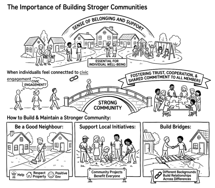 When individuals feel connected to their community, they are more likely to participate in civic engagement and contribute to collective problem-solving. A strong community acts as a bridge between individuals and the broader society, fostering trust, cooperation, and a shared commitment to the well-being of all members.