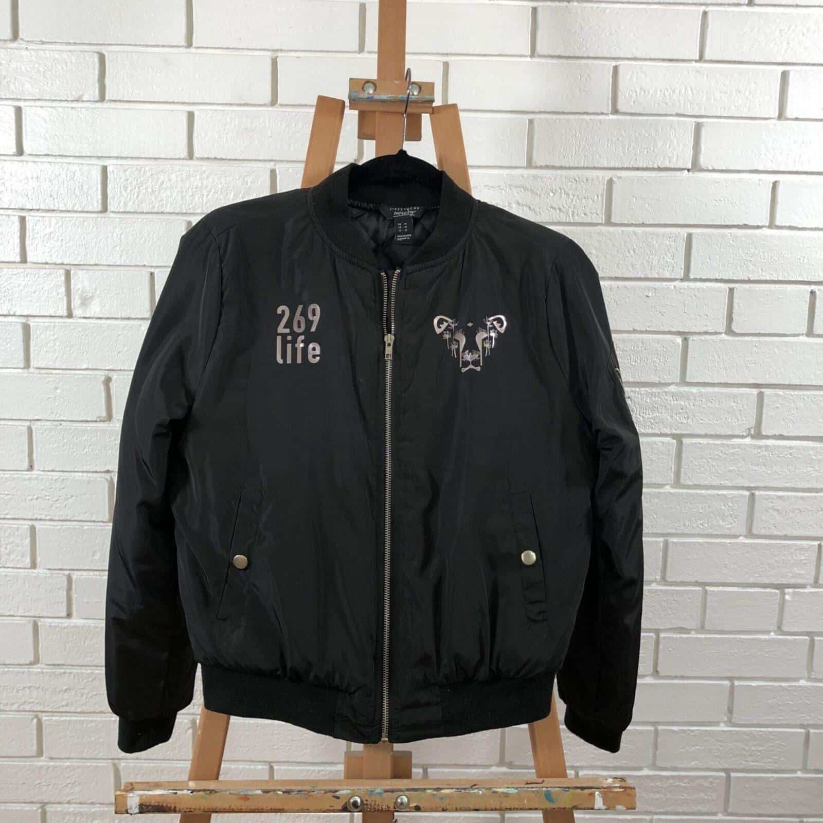 Up-cycled 100% polyester black bomber style jacket. Detail includes “269 life” on the right chest and “Dandi Lion” logo on the left. Back detailing “LIBERATE ANIMALS”. Size medium (fits small). All sales from this purchase will be donated to 269 Life funding.