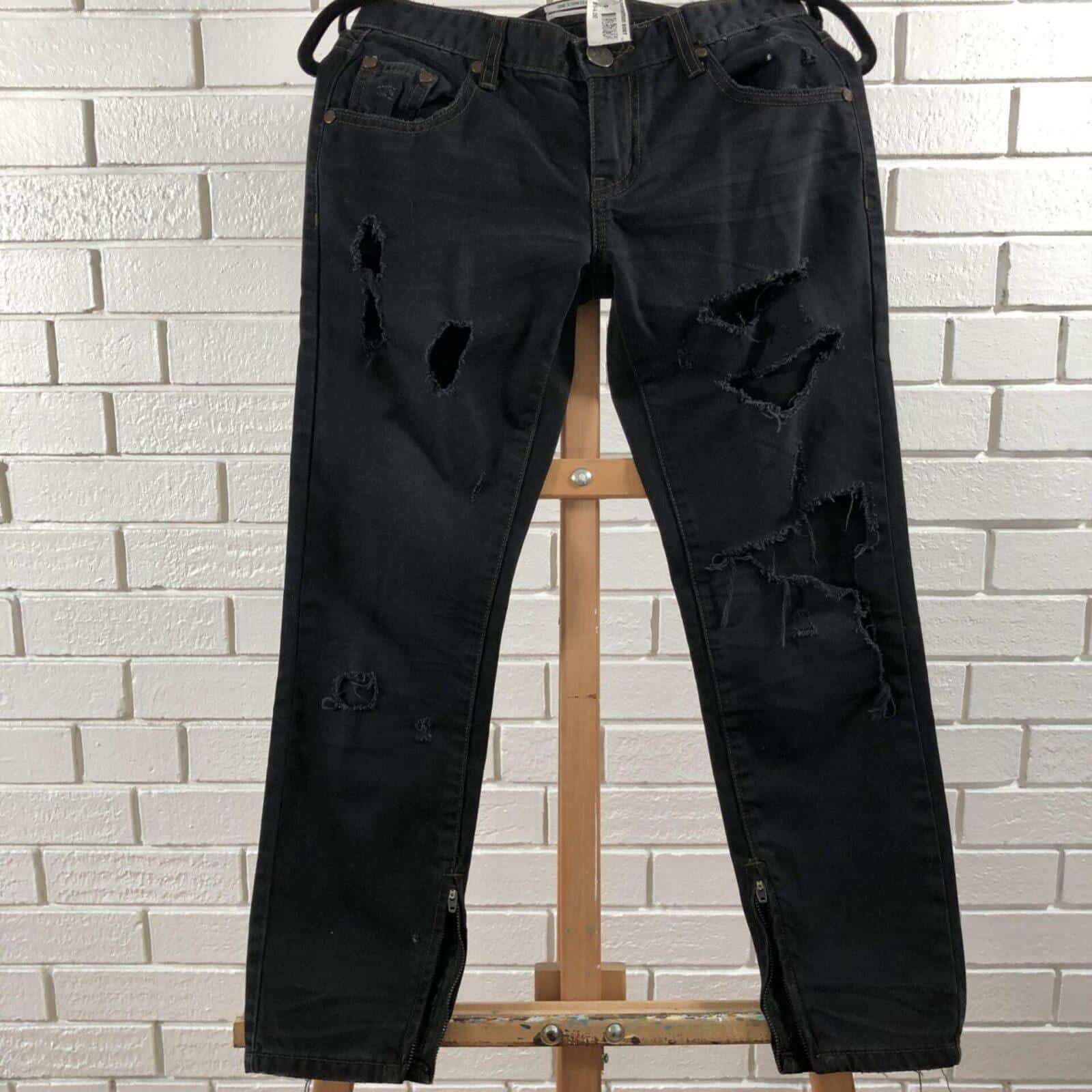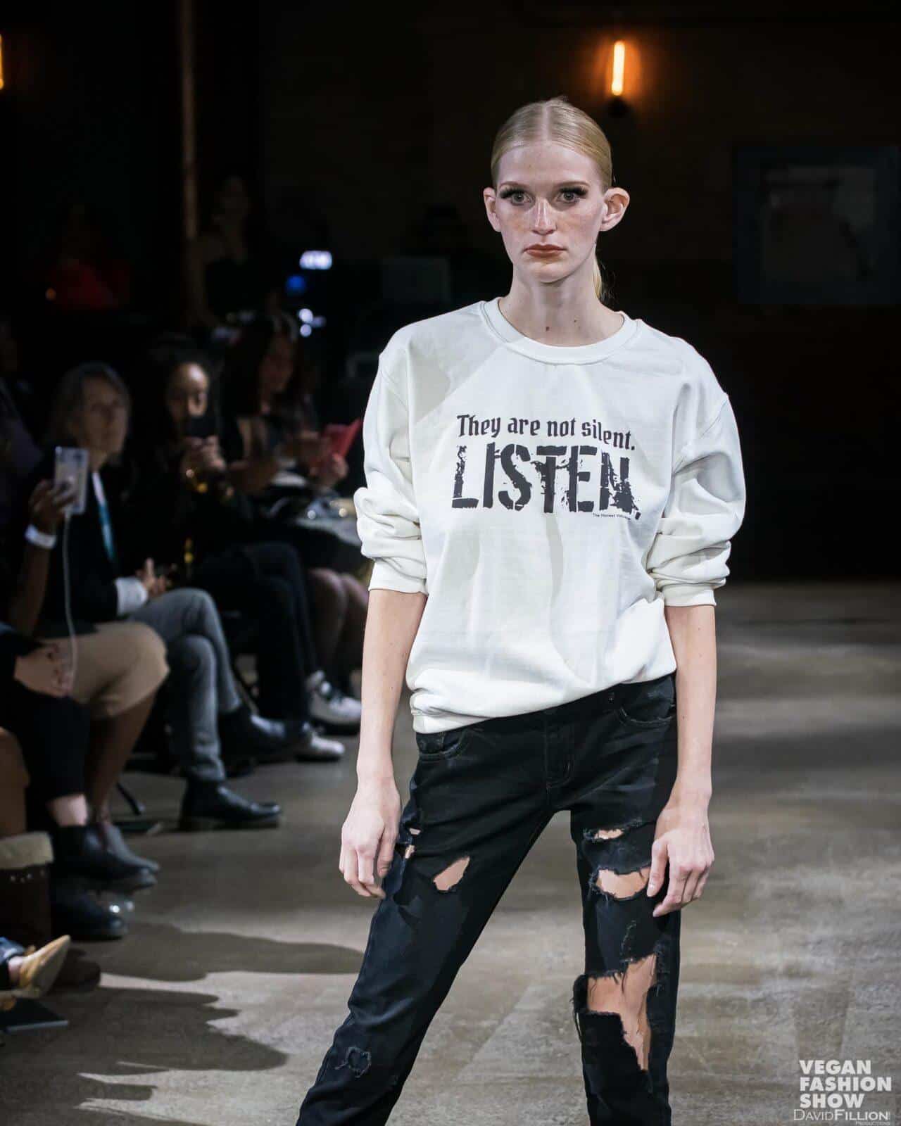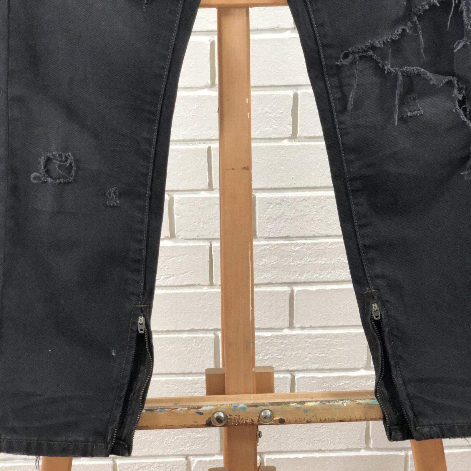 Up-cycled, distressed, ripped, black denim capris. Custom iron-on ankle trim detailing “Nobody is silent.” on the left ankle and “Many are not heard.” on the right ankle. Zippers added on the ankles for an optional flare look.