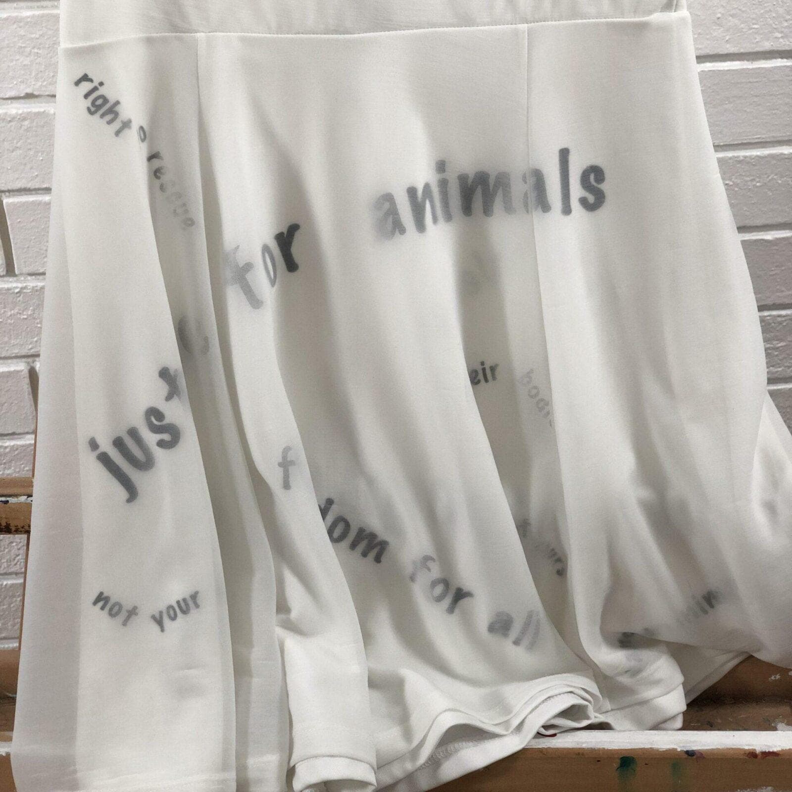 White animal rights chant dress. Up-cycled with black detailing on the under skirt (various animal rights chants). Size small.