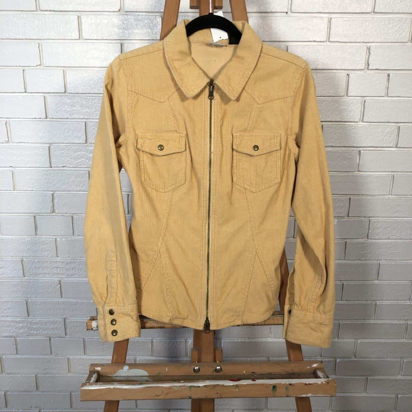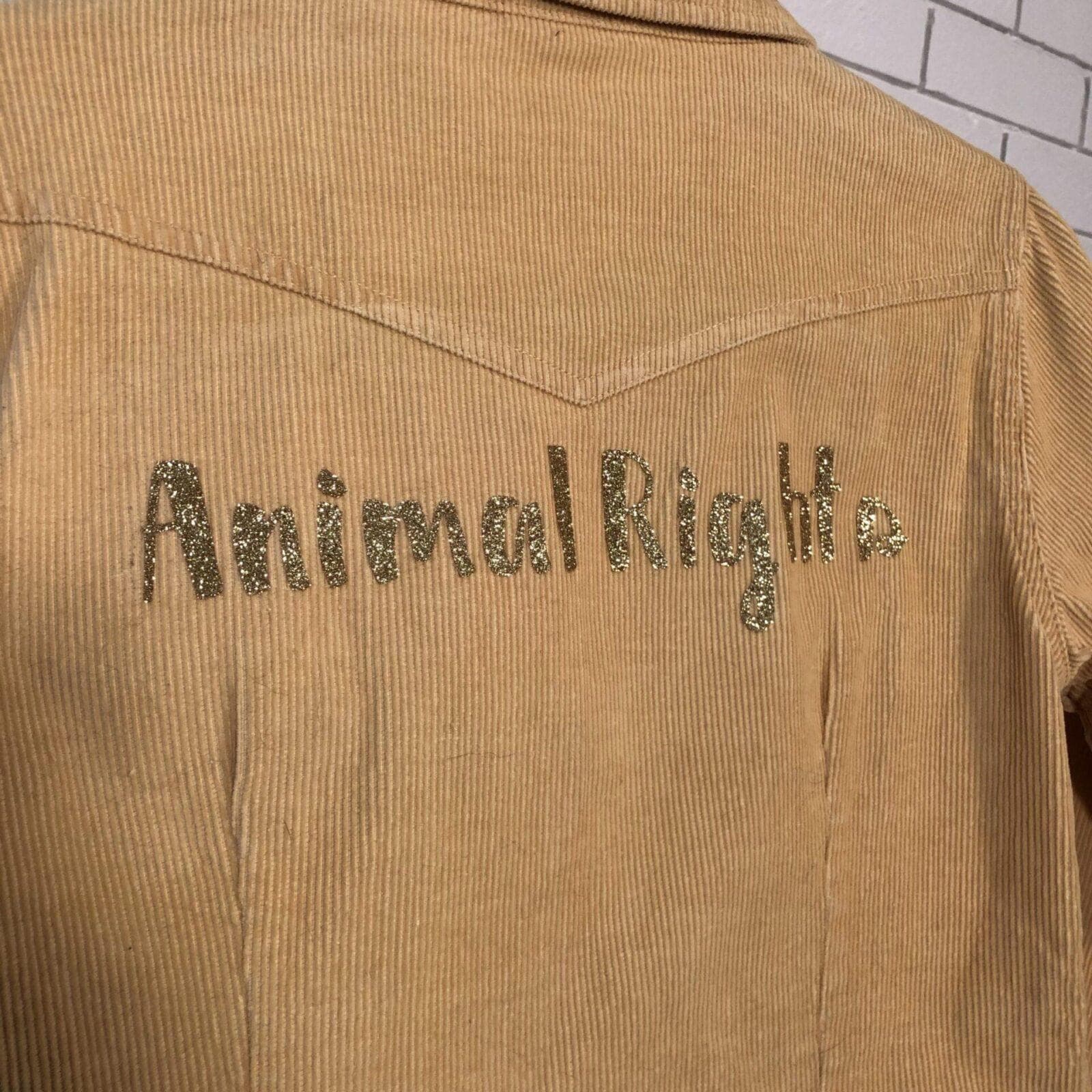 Up-cycled yellow corduroy animal rights jacket. Custom back text detailing in gold glitter iron-on “Animal Rights”. Size medium.
