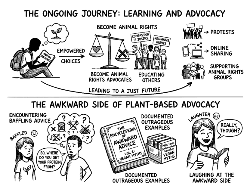 As you engage in advocacy, you’ll inevitably encounter some truly baffling advice from non-vegans! We’ve documented the most outrageous examples in our blog about funny and harmful vegan myths. It’s a great resource for anyone looking to laugh at the awkward side of plant-based advocacy.