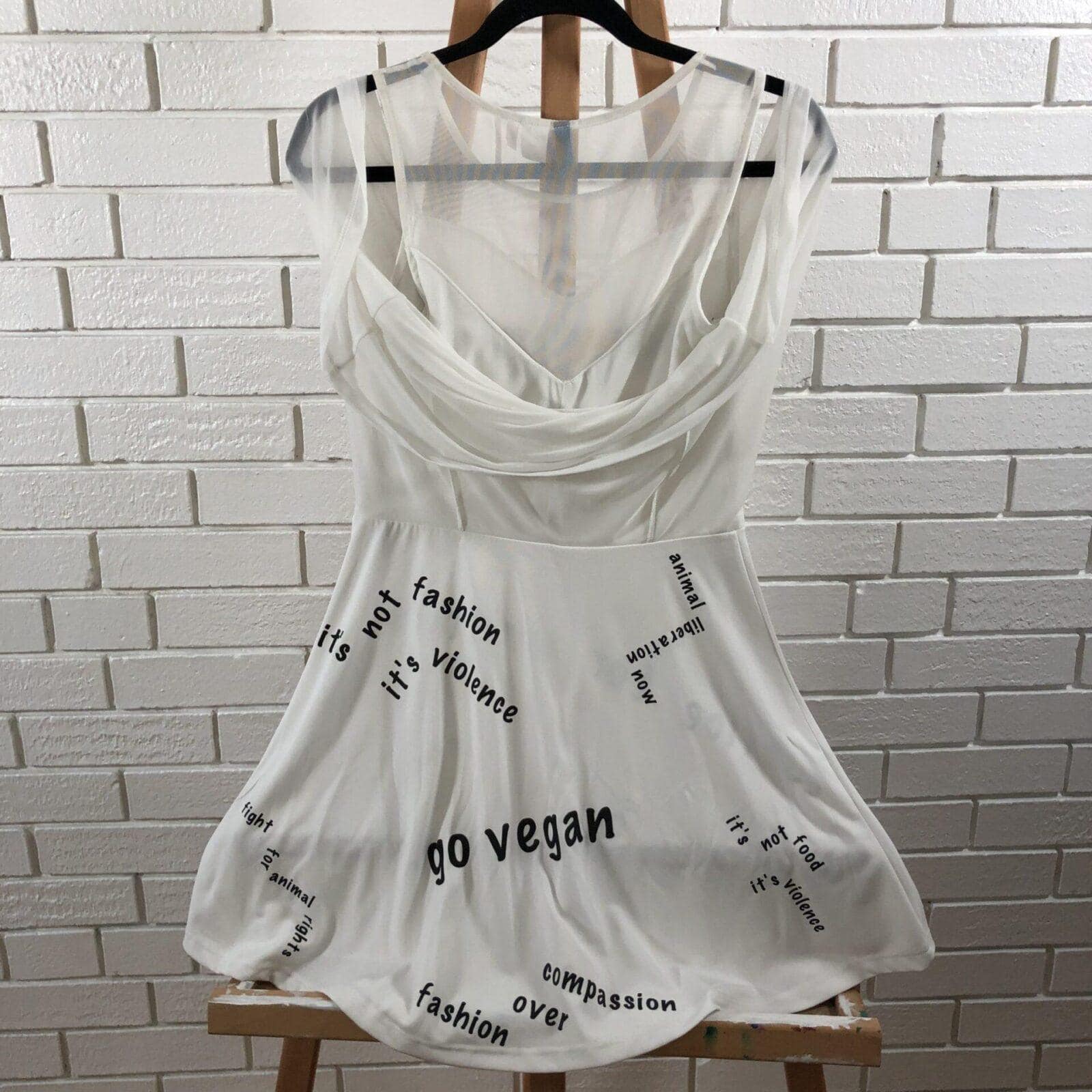 White animal rights chant dress. Up-cycled with black detailing on the under skirt (various animal rights chants). Size small.