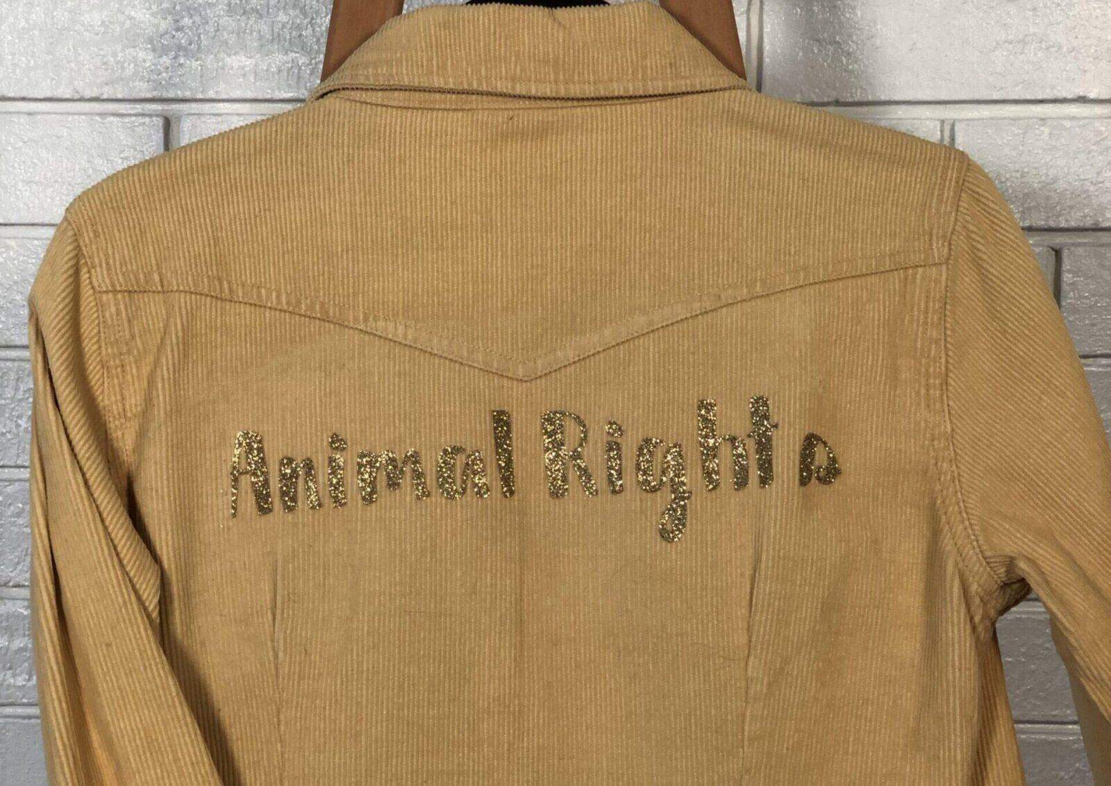 Up-cycled yellow corduroy animal rights jacket. Custom back text detailing in gold glitter iron-on “Animal Rights”. Size medium.